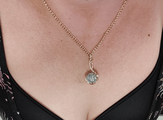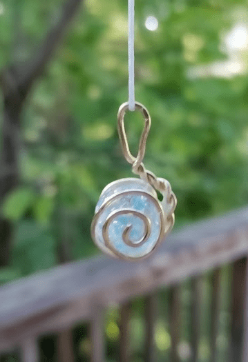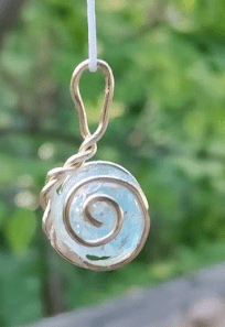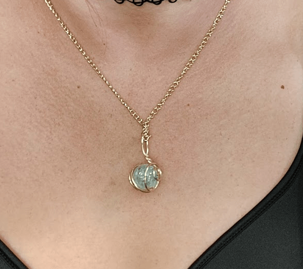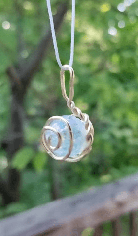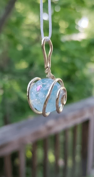 This Minnesota-made marble was sustainably created and bound with gold wire. The marble is a sparkly, frosted blue and the bead embellishments frame the hand-wrapped centerpiece.