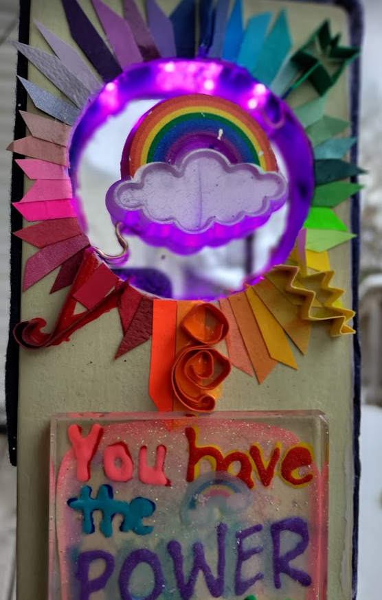 Materials: resin, paper, wood, paint, glue, purple lights, mirror, and fabric